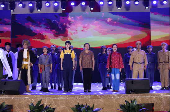 文藝演出結(jié)束,全場起立,共同高唱《沒有共產(chǎn)黨就沒有新中國》,熱烈掌聲經(jīng)久不息。